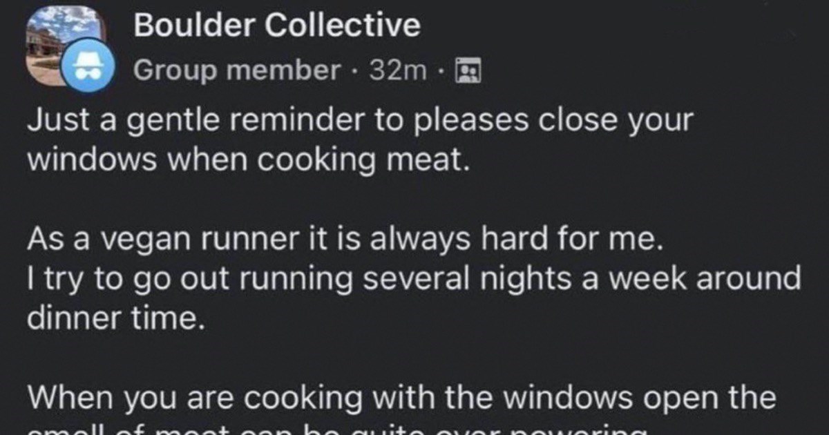 This is a wild tale of a neighbor who thinks the world should revolve around them — specifically, they’d like the neighbors to be considerate during their runs. In a post to the Boulder Collective group, this person asked as a "gentle reminder" that folks in the neighborhood who are cooking meat for dinner should shut their windows. Why? So they don’t have to smell any meat cooking while they runs through the neighborhood!